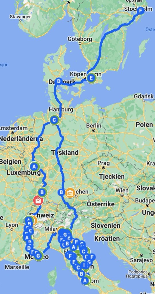 Time flies and soon it’s time for the 2025 Grand Tour. We’ve adjusted the route slightly and will skip France and Switzerland. Instead taking the ferry from Gothenburg to Kiel and drive south through Germany. on the way back, we might drive through Denmark. Subject to timing of ferries.