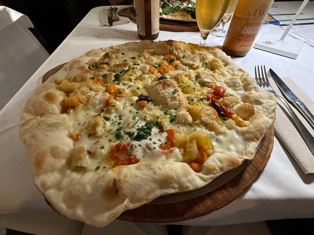We tried out the rooftop pool before dressing up for dinner. Tonight we opted for pizza at a restaurant near the sea.