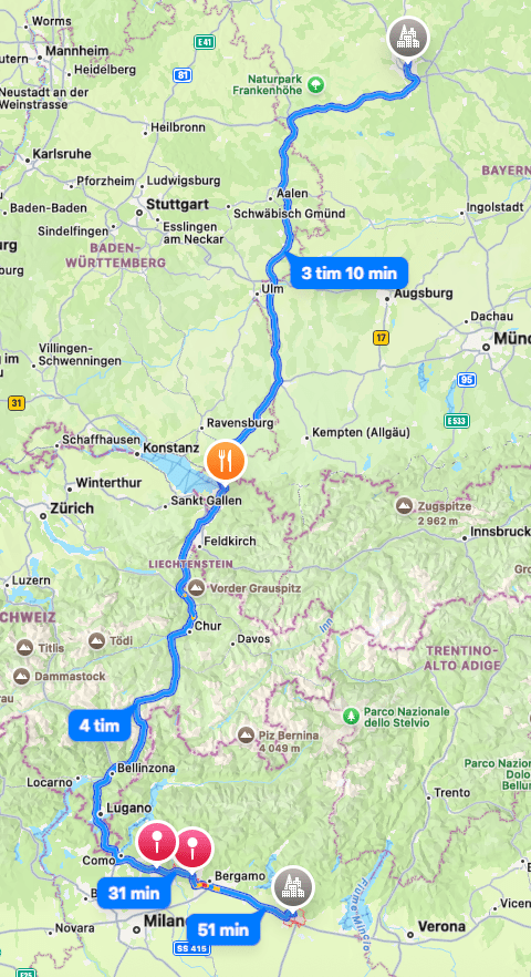 The last transit drive today, from Nürnberg to Brescia. Always a lovely sight when the Alps begin to appear in the horizon. In order to avoid getting stuck around Munich, we decided to go a bit westward. Quite a long drive today, but rather be on the move than stuck in urban traffic.