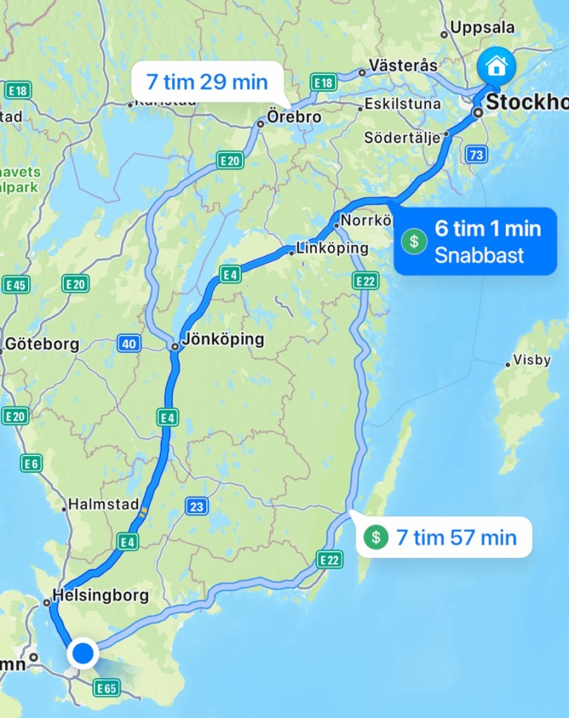 Final stretch, Lund to Åkersberga (north of Stockholm). The weather forecast indicated rain. So, we opted for highway driving to get home. 630 km among caravans, mobile homes, and the usual trucks on the highway. Not our definition of fun driving, But an effective way to get home. We did take a look at the Calimoto app though. Then it would have taken us 12 hours instead of 6 hours. Maybe another time.