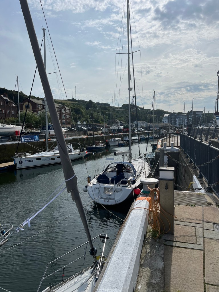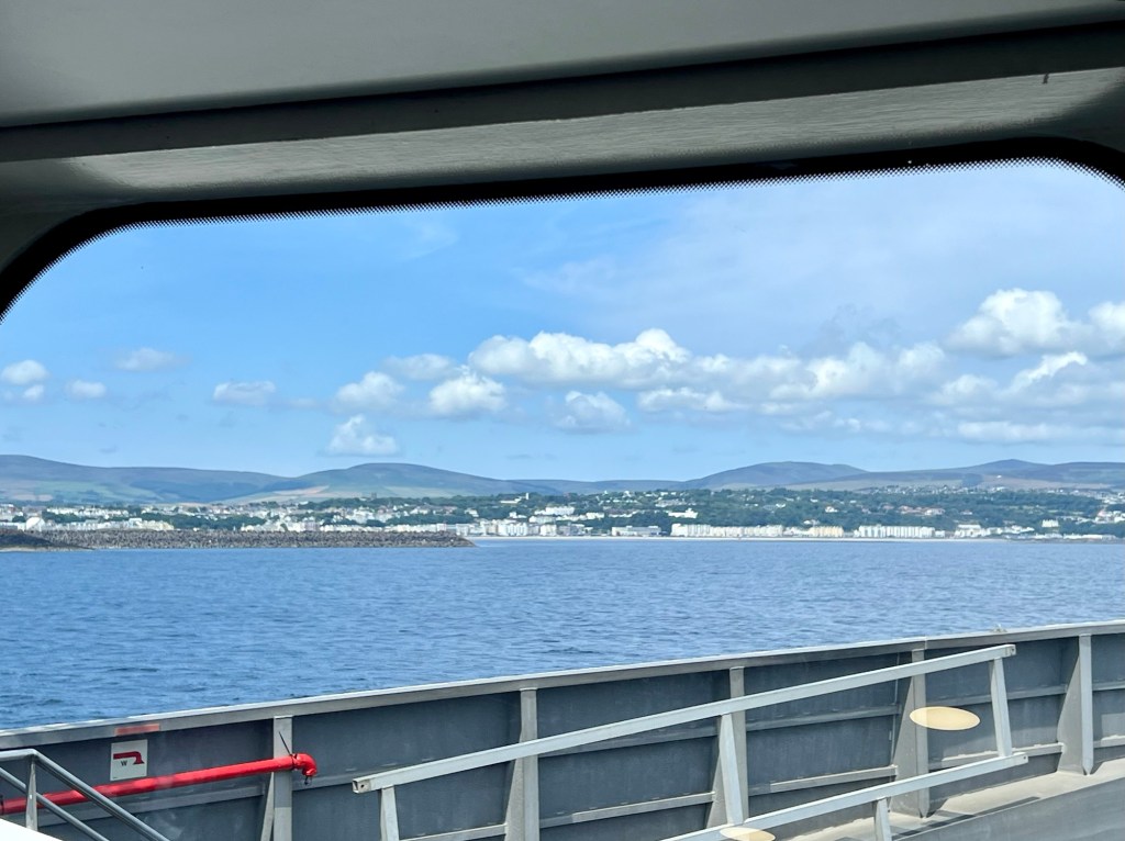 Waiting to embark the ferryA fancy looking building in Belfast harbourBelfast harbourSecond breakfastLeaving Belfast behind usA first glimpse of Isle of ManA supporting lighthouseDouglas