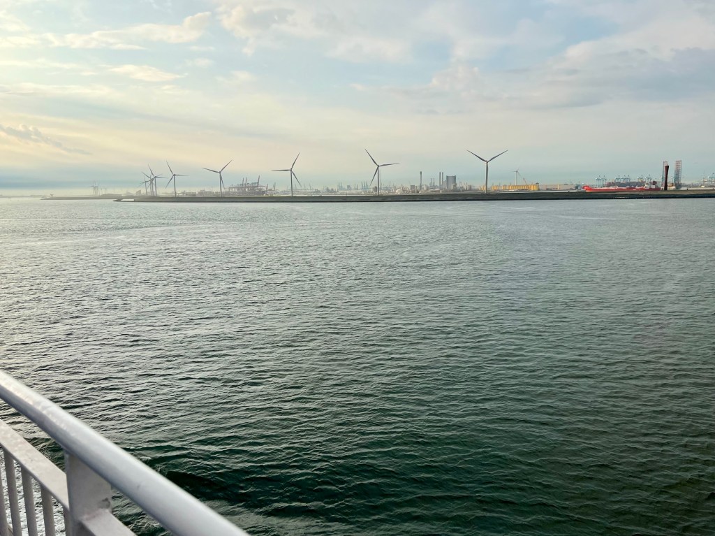 We had to skip the breakfast at the hotel in order to catch the ferry. So, we had a light breakfast on the ferry. We had booked seats in front of the boat. The views were great snd the sea calm. There were a few fishing boats, many wind turbines, and some gas/oil riggs.