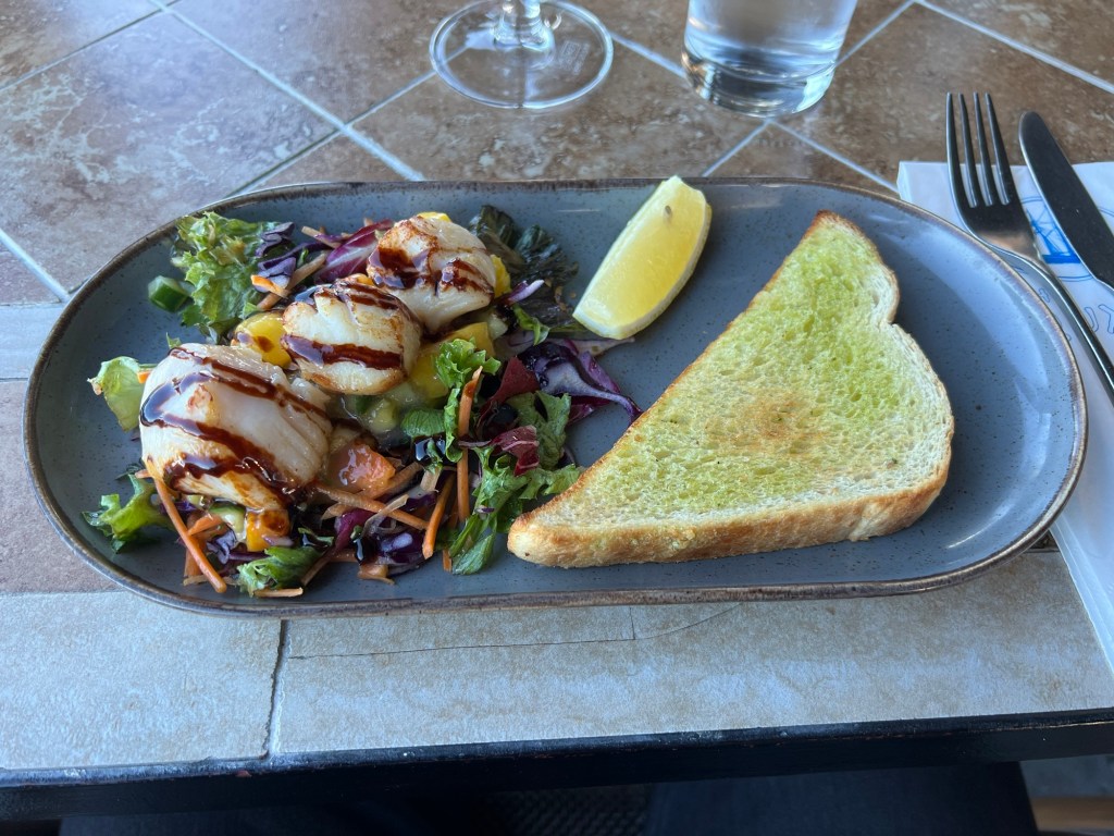 The road up towards the Vee passView from the Vee passSteep road in CobhThe Commodore hotelThe beach walk in CobhWe had a lovely dinner at the QuaysScallopsRavioli Local brew, Murphy’sWe drove 339 km today