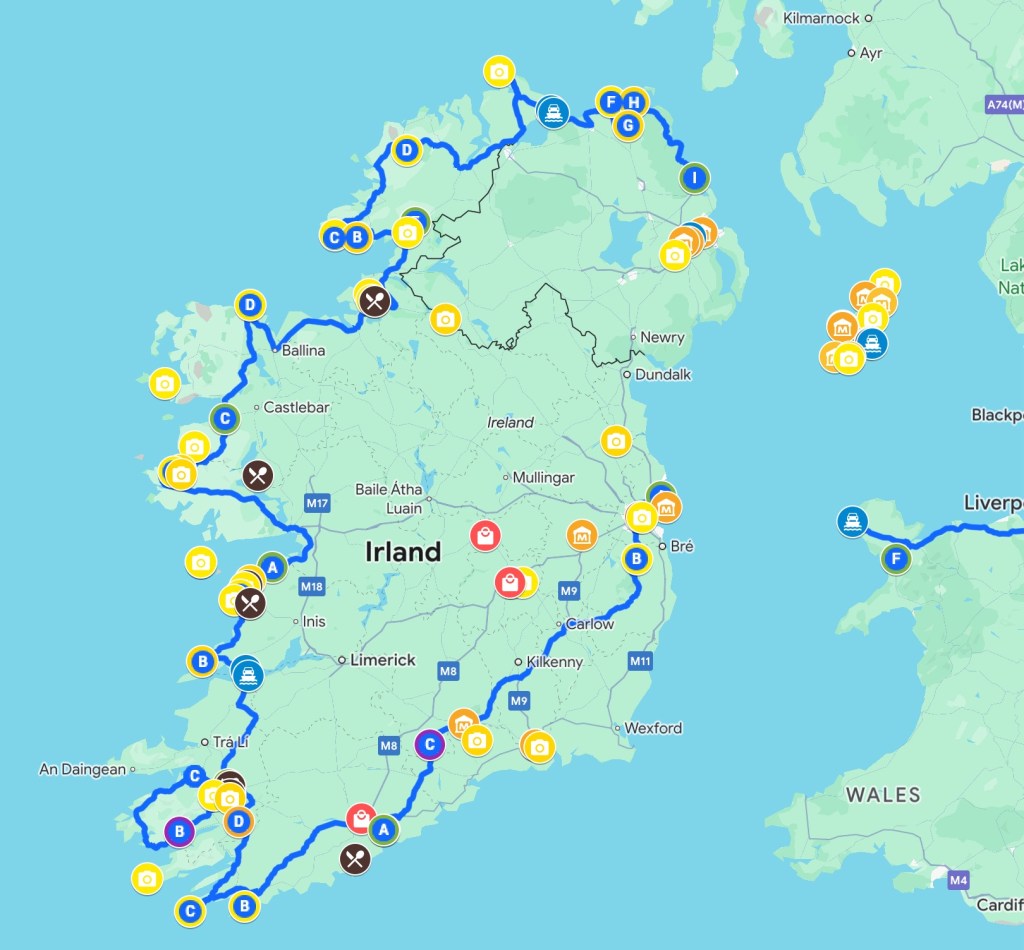 Accomodations, we stayed at the following hotels and B&Bs; Good Morning Hotels in Lund, Sweden. This was just for a nights sleep while in transit. Very simple standard, but clean rooms, friendly staff and to our surprise a bar with outdoor seating. Works well if you just needs somewhere to sleep. Cheap as well at 984 SEK for a twin bed room. Black Boy Inn Hotel in Caernarfon, Wales. This was for the second night during the transfer to get to Ireland. A charming hotel within the city walls. Limited parking next to the hotel, so we had to park a bit further away. Parking was free during evening and night. 1.725 SEK for a twin bed room. We didn’t have time to try the breakfast in the morning since we had a ferry to catch. White Sands Hotel in Portmarnock was the first hotel on Ireland. Located just north of Dublin. In the evening, there was some football going on so the hotel bar was fully booked. It turned out that there weren’t any options nearby to get some food. The room costed 1.891 SEK for a twin bed room excluding breakfast. Parking was free outside the hotel. The next stop was Cork where we stayed at Commodore Hotel in Ballyvoloon. This was a really nice hotel, next to the water. There were several restaurants nearby, parking was free along the street during evening and night. The hotel also had an underground parking. The room costed 1.723 SEK for a twin bed room including breakfast. We continued our journey to Killarney where we stayed two nights at Killarney Court Hotel. We must have missed something when we did our research. This turned out to be a very busy and noisy hotel next to a major junktion and a service station. Luckliy, the city center was within walking distance. We opted to have breakfast at a little french café instead of the hotel. Parking was free just outside the hotel. Two nights in a twin bed room costed 3.536 SEK including breakfast (which we skipped).